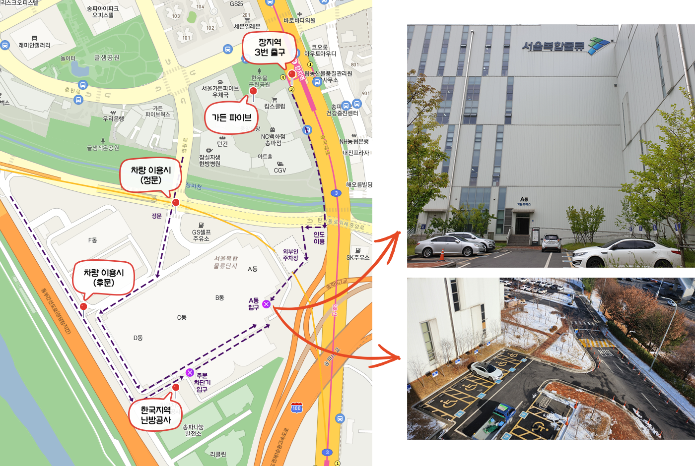 잠실 방면(2호선)에서 오실 경우 8호선(모란행)으로 환승 → 장지역 하차 3번 출구 도보 10분